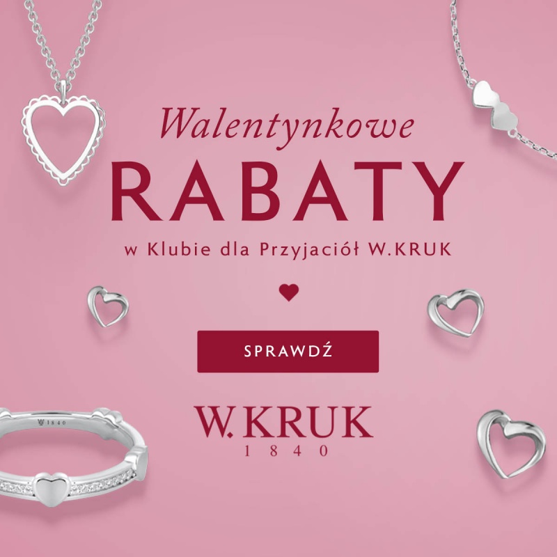 Promocja skierowana do nowych i obecnych Członków Klubu dla Przyjaciół W.KRUK. Oferta obowiązuje od 16.01.2026 do 16.02.2026. Rabat naliczany jest od cen regularnych i nie łączy się z innymi promocjami. Szczegóły i wykluczenia dostępne w salonach i w regulaminie na wkruk.pl